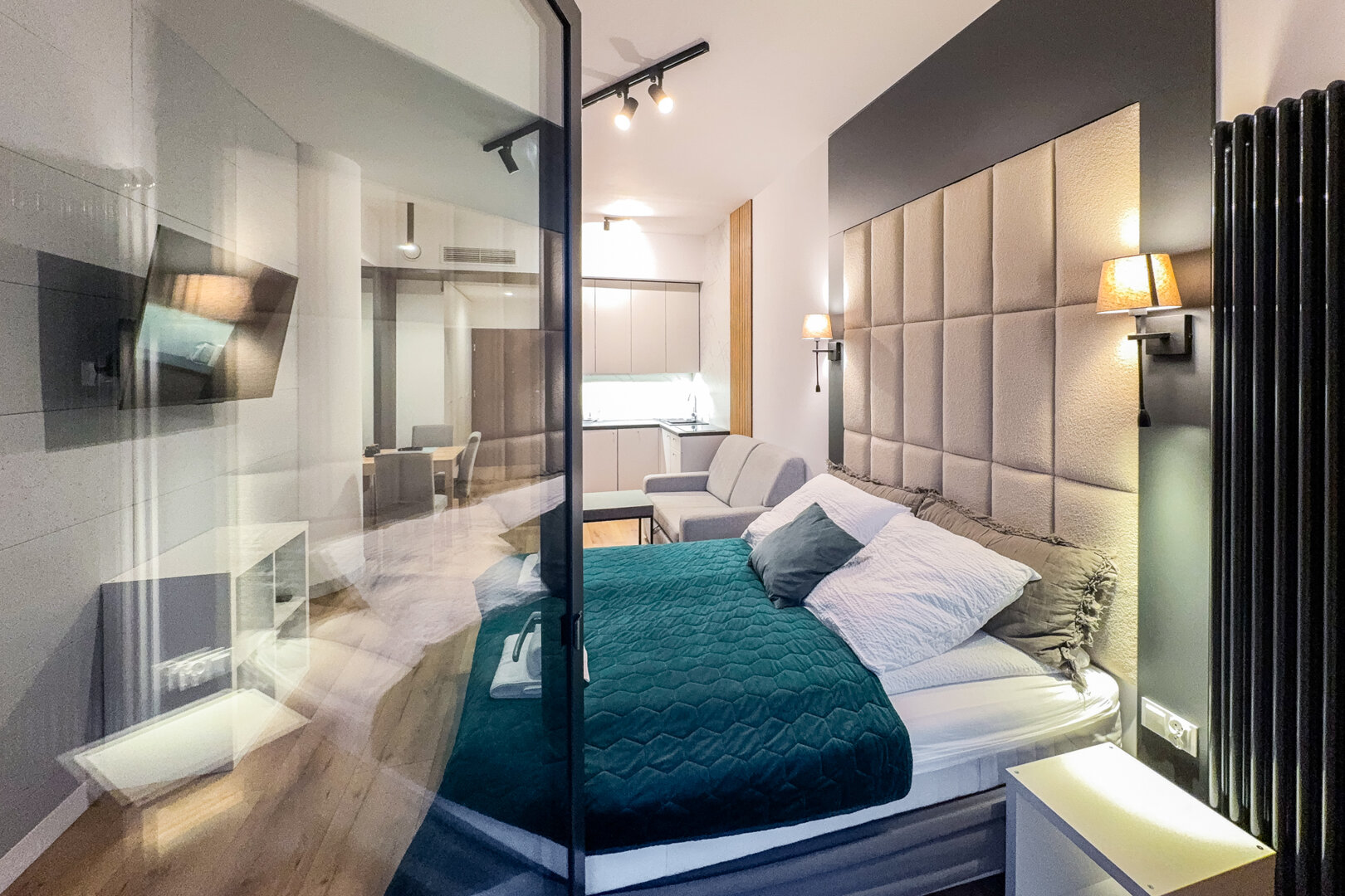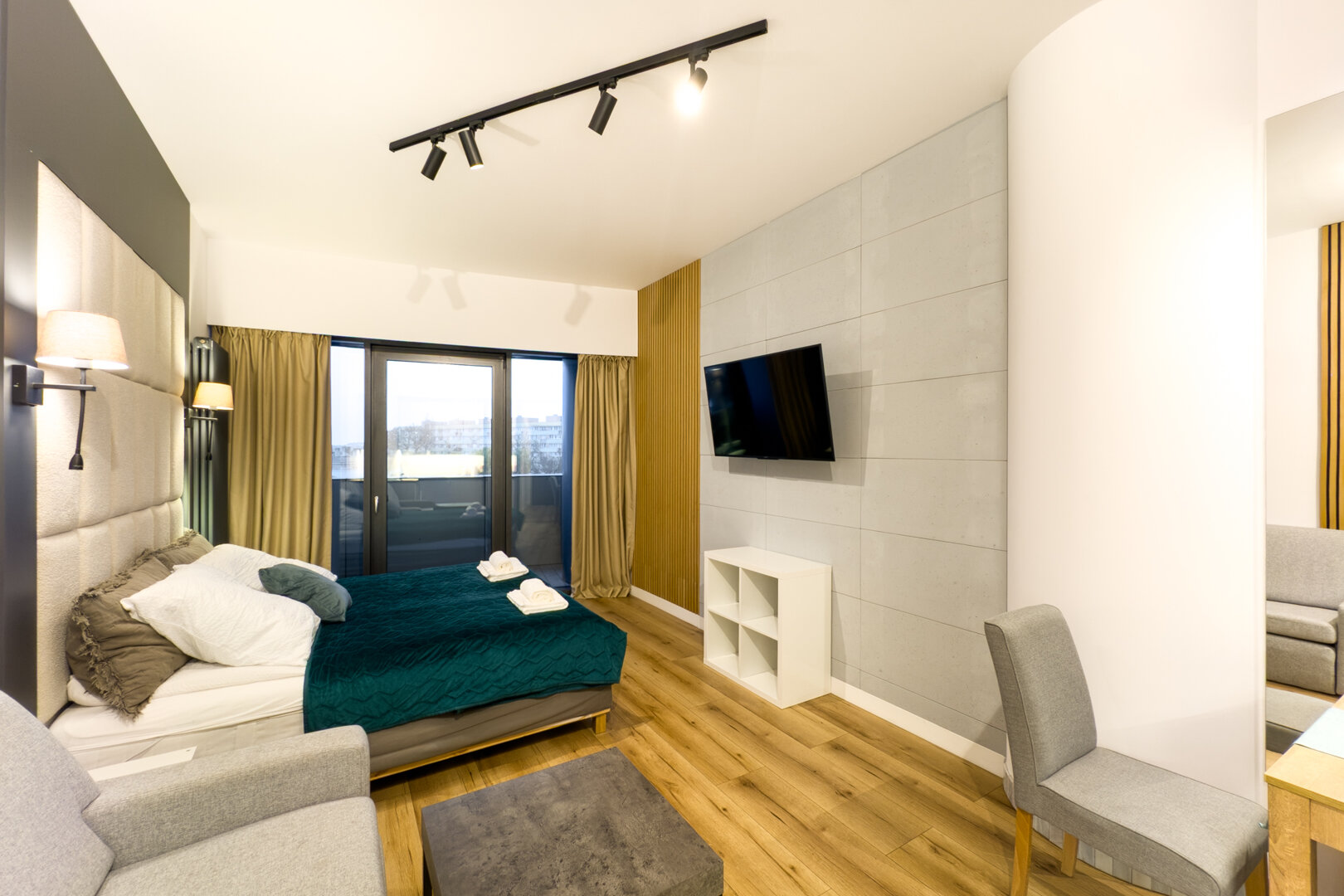 Apartament na 17 piętrze w Hanza Tower z widokiem na panoramę miasta, duże podwójne łóżko, rozkładana sofa, aneks kuchenny. Bezpłatny dostęp do strefy basenowej z saunami i jacuzzi. Taras widokowy na dachu apartamentowca.