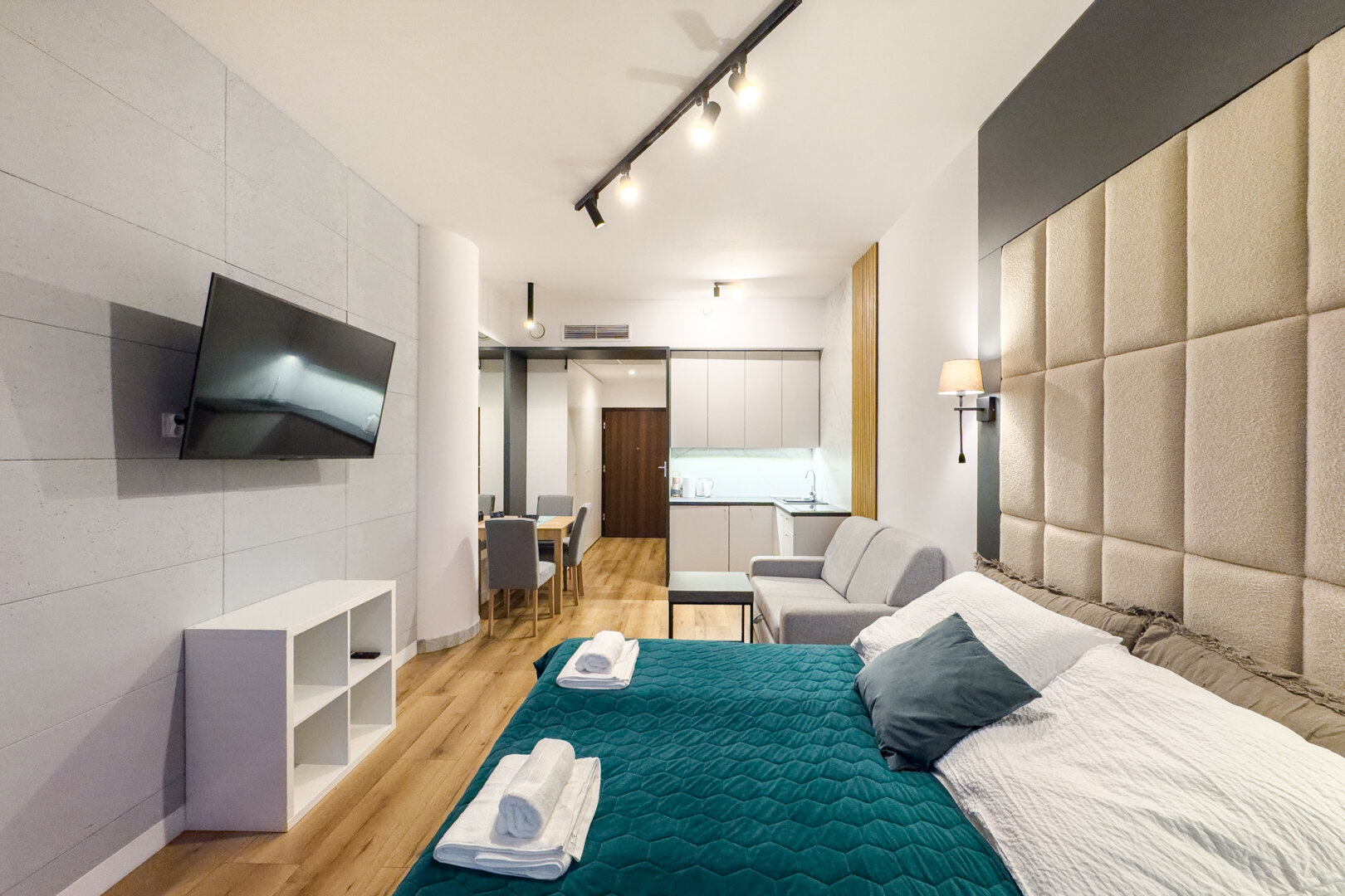 Apartament składa się z salonu z aneksem kuchennym, podwójnym łóżkiem i rozkładaną sofą oraz łazienki z prysznicem. Do dyspozycji naszych klientów jest także duży, zabudowany balkon z widokiem na miasto. Mieszkanie wyposażone jest w niezbędny sprzęt AGD (czajnik elektryczny, płyta indukcyjna, zmywarka, lodówka i pralka), przybory łazienkowe i kuchenne. W salonie znajduje się telewizor z dostępem do telewizji kablowej. Apartament posiada własną bezpłatną sieć Wi-Fi. Nasi goście bez dodatkowych opłat mogą w pełni korzystać z pięknego krytego basenu, saun oraz jacuzzi, które znajdują się na 1-szym piętrze. Do dyspozycji jest również taras na 27 piętrze z zapierającym dech w piersiach widokiem na panoramę miasta. Goście, którzy do naszego obiektu przyjadą samochodem mają możliwość wykupienia miejsca parkingowego w garażu podziemnym. Serdecznie zapraszamy.
